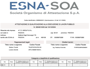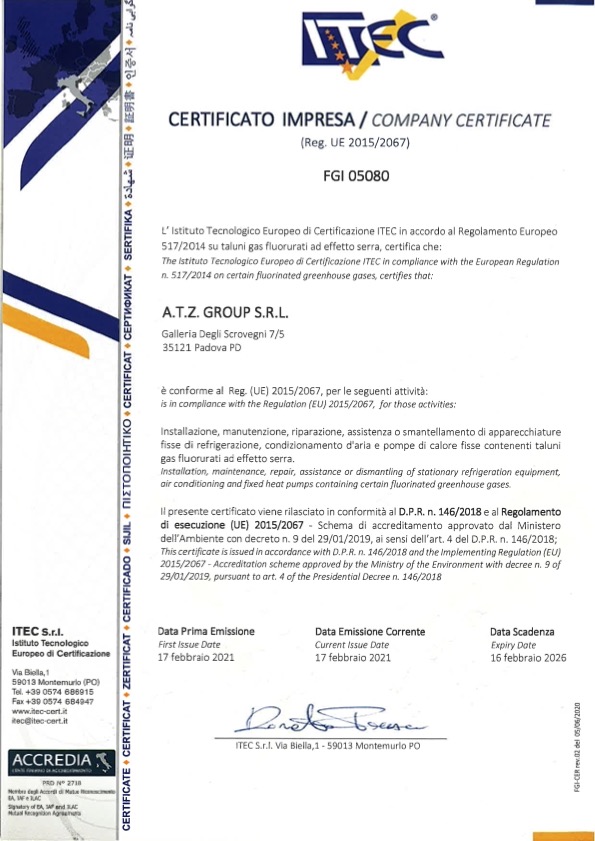 CERTIFICAZIONE ISO 9001 N. IT21/0335ATTESTAZIONE SOA N.63009/10/00CERTIFICAZIONE F-GAS N.FGI 05080